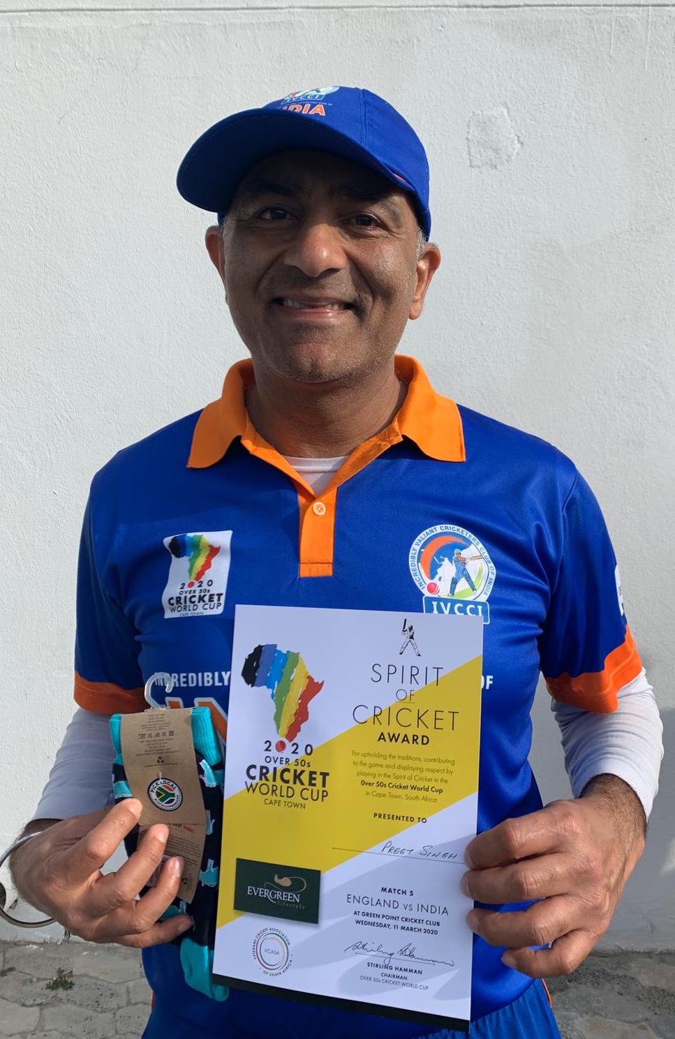 Our very own KCC member, Preetinder Singh, has been included in the India squad for the Over-50s World Cup Tournament being played between March 11-24 this year at Stellenbosch and Cape Town in South Africa. During trials in Mumbai the India selectors were impressed by his all-round abilities and, in particular, his agility in the field. Sadly, the tournament was abandoned midway due to the Covid-19 scare, but not before Preet had won the Spirit of Cricket Award for his efforts in his first match. Congratulations Preet, and we all wish you every success in future campaigns.
