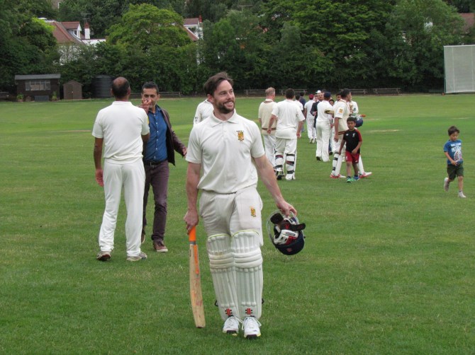 111 for 0 at drinks and it quickly became a game of ‘run containment’ in the hope we could limit the Hampstead score and chase down whatever they posted in their 40 overs given our strong batting line up. The introduction of Saurav proved vital, as did the fielding intervention from Bernard at long off. He broke the dangerous opening stand with an unbelievable catch just inside the boundary rope running at full pace. This provided the disruption in momentum to the Hampstead innings that we were seeking (as too did the very generous decision of Fergal to retire out when he reached his century shortly thereafter).